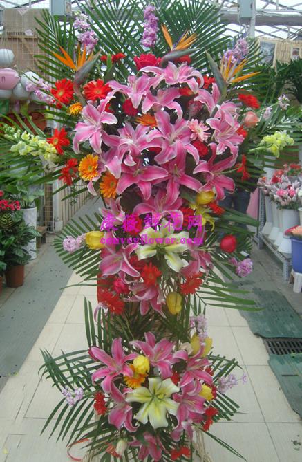 材料:香水百合,玫瑰,扶朗,绿叶间插,大鸟等,三层花篮一个高1.8米