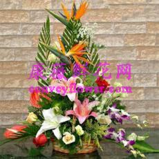 材料:红掌2片,粉百合2朵,白百合1朵,泰国兰3枝,黄金鸟2个,红玫2枝,绿叶等.手提花篮一个,此花需预定,并限送市区一级