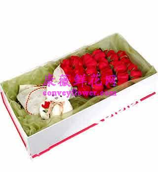 24支红玫瑰,丝带包扎,送小熊一只,高档礼盒包装