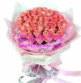 99支粉色玫瑰,粉色皱纹纸、棉纸圆形包装