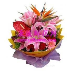 材料:多头粉香水百合3枝,红掌1片,天堂鸟2枝,粉扶郎2枝、康乃馨6枝,米兰搭配。黄色手揉纸(此花需提前预定,并限送各大城市)