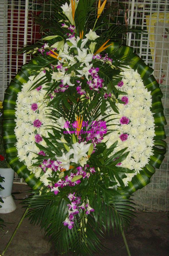 材料:大量白菊花,搭配白色白合,泰国兰,天堂鸟等组成花圈一个,直径1.3-1.5米