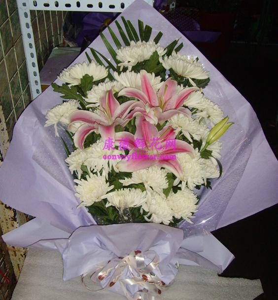 材料:白菊22枝,粉色多头百合1枝,绿叶搭配,手揉纸单面包装