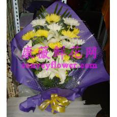 材料:黄白菊共22枝,白多头香水百合1枝,绿叶搭配,手揉纸单面包装