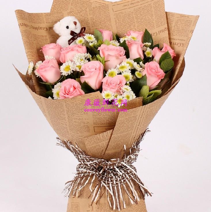 11支粉色玫瑰黄莺1小熊英文报纸圆形包装
