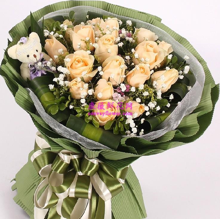 19支香槟玫瑰墨绿色包装满天星1小熊